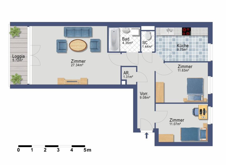 Die ca. 76 m² reine Wohnfläche (+ 6m² Loggia) verteilen sich optimal: