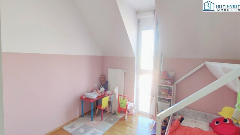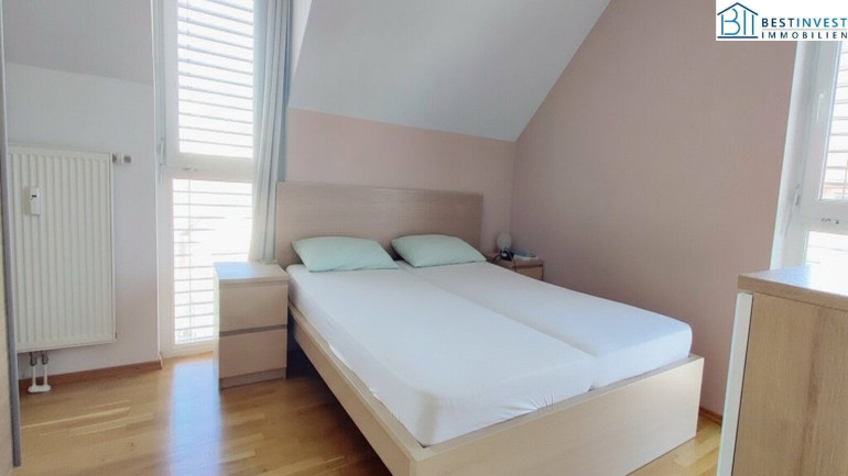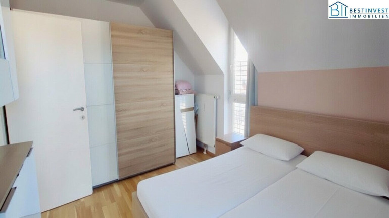 2 Schlafzimmer und einem Gäste-Bürobereich, Badezimmer, Abstellraum und einen ca. 20m² großen Dachboden zum lagern.