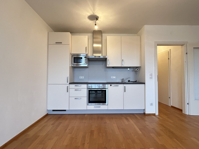 Der großzügige Wohn- und Essbereich bildet das Herzstück der Wohnung und bietet direkten Zugang zum 4,8 m² großen Balkon. Die vorhandene Einbauküche ist mit Geschirrspüler, E-Herd, Mikrowelle und Kühlschrank ausgestattet.