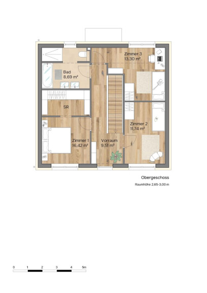 Herzstück ist die großzügige Wohnküche mit praktischer Speis, die sich zum Garten hin öffnet: drinnen leben, draußen weiteratmen. Die 2,85 m Raumhöhe im Erdgeschoss verstärkt das großzügige Raumgefühl und verleiht dem Zuhause eine besondere Weite. Im Wohnzimmer sorgt ein sehr großes Fenster mit einer Parapethöhe von nur 43 cm für extra viel Licht – ideal, um den Bereich mit einer integrierten Sitzfläche als gemütlichen Lieblingsplatz zu gestalten. Eine großformatige Verglasung inklusive Hebeschiebetüre zur Terrasse bilden einen fließenden Übergang zwischen Innen und Außen. Drei Schlafzimmer schaffen Rückzugsorte für jedes Familienmitglied, ergänzt durch einen Schrankraum und zwei Bäder für entspannte Morgen und ruhige Abende.