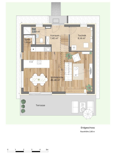 Die dargestellten Schaubilder wurden teilweise digital bearbeitet bzw. mithilfe künstlicher Intelligenz visualisiert. Sie dienen ausschließlich der beispielhaften Darstellung von Einrichtungs- und Gestaltungsmöglichkeiten und stellen keinen verbindlichen Ausführungs- oder Lieferumfang dar. Maßgeblich für die tatsächliche Ausführung sind ausschließlich die vertraglichen Vereinbarungen, Bau- und Ausstattungsbeschreibungen sowie die genehmigten Pläne. Abweichungen in Ausstattung, Materialien, Farben, Möblierung oder Bepflanzung sind möglich.