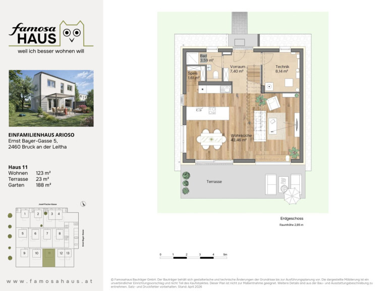 In Bruck an der Leitha (Ernst Bayer-Gasse 5) bieten 13 Einfamilien- und Doppelhäuser, Raum für alle, die das Leben gern nach draußen erweitern: Frühstück auf der Terrasse, Spielen im Eigengarten, Ankommen in einem Zuhause, das sich leicht anfühlt. Ziegelmassiv und als Niedrigenergiehaus geplant, belagsfertig übergeben und bereit für den nächsten Lebensabschnitt – mit durchdachten Details, die Komfort spürbar und Kosten kalkulierbar machen. Nur noch wenige Einheiten verfügbar!