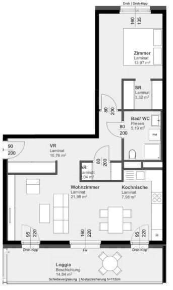Die Wohnung gliedert sich in folgende Räumlichkeiten: