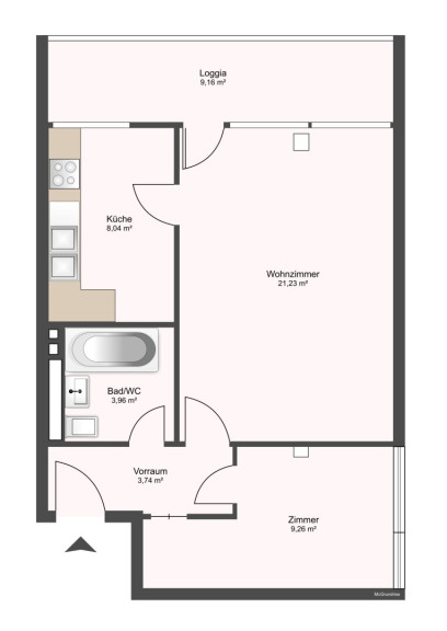 Die Wohnung befindet sich im 2. Stock (ohne Lift) und überzeugt durch eine durchdachte Raumaufteilung: Über den Eingangsbereich gelangen Sie in das Badezimmer, ausgestattet mit Dusche, WC, Waschbecken und einen Waschmaschinenanschluss.
