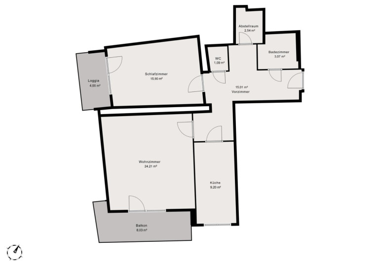 Besonders hervorzuheben ist die durchdachte, zentral begehbare Raumaufteilung, die ein angenehmes Wohngefühl schafft. Das helle Wohnzimmer mit Südausrichtung bietet direkten Zugang zum großzügigen Balkon (ca. 8 m²) – ideal für sonnige Stunden. Das ruhig gelegene Schlafzimmer ist nach Westen orientiert und verfügt über eine eigene Loggia (ca. 4,6 m²) – perfekt für entspannte Abendstunden.
