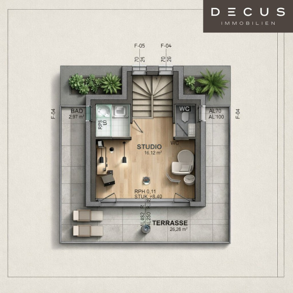 Ein Studio mit direktem Zugang zur großzügigen Dachterrasse eröffnet Ihnen vielfältige Nutzungsmöglichkeiten – ob als Rückzugsort, Atelier oder Loungebereich mit beeindruckendem Ausblick.