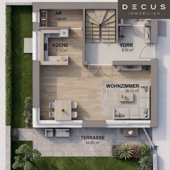 Bereits das Erdgeschoss überzeugt mit einem offenen, lichtdurchfluteten Wohn- und Essbereich, der ein einladendes Ambiente für Familie und Gäste schafft. Eine praktische Abstellkammer sowie ein Gäste-WC ergänzen diese Ebene perfekt.