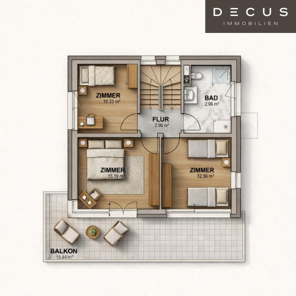 Im Obergeschoss erwarten Sie drei großzügige Schlafzimmer, zwei davon mit eigenem Balkon. Ein modernes Badezimmer schafft hier Ihre persönliche Wohlfühloase.