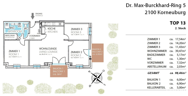 - BALKONE: Ja – 2 Balkone ca. 12,90 m² - hofseitig/süd-ost-westseitig