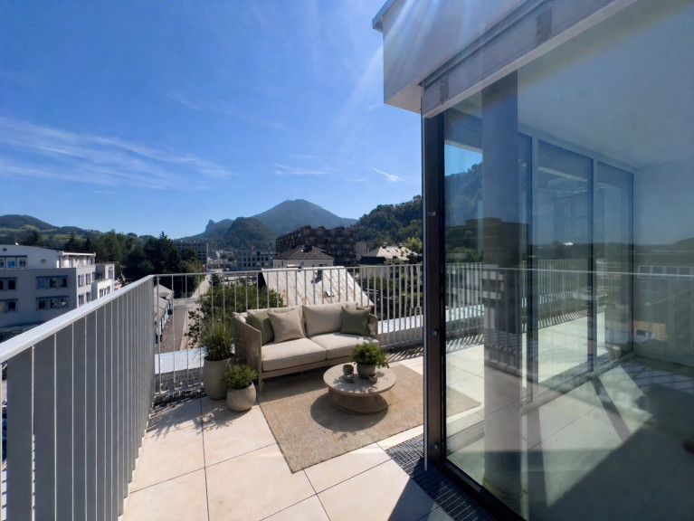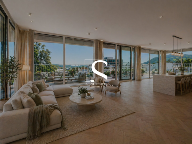Dieses exklusive Penthouse liegt im Dachgeschoss eines hochwertig realisierten Neubauprojekts, das Ende 2023 fertiggestellt wurde. Großzügige Glasflächen und eine umlaufende 360°-Dachterrasse lassen den Blick auf Kapuzinerberg, Gaisberg und Maria Plain frei schweifen – ein Wohngefühl über den Dächern der Stadt, das seinesgleichen sucht. Der barrierefreie Zugang führt Sie bequem mit dem Aufzug direkt in Ihre Wohnung. Ein zentraler Vorraum erschließt alle Räume: Ein großzügiger Masterbedroom, ein stilvolles Badezimmer mit Badewanne, Walk-in-Dusche und abgetrenntem WC, ein weiteres Zimmer sowie ein praktischer Abstellraum. Das Herzstück der Wohnung bildet der offen gestaltete Wohn-, Ess- und Kochbereich mit raumhohen Glasfronten und großen Schiebetüren – lichtdurchflutet und mit einzigartigem Panorama. Im Haus stehen Tiefgaragenplätze zum Erwerb bereit. Zusätzlich stehen ein Fahrradraum, ein Kellerabteil sowie ein Wasch- und Trockenraum zur gemeinschaftlichen Nutzung zur Verfügung. Ein Penthouse für alle, die urbanes Leben mit architektonischer Klarheit und beeindruckender Aussicht verbinden möchten.