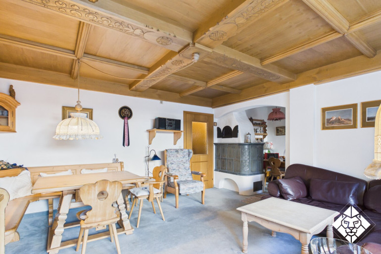 Das Wohnzimmer überzeugt durch eine gemütliche und zugleich hochwertige Atmosphäre. Ein traditioneller Kachelofen sorgt an kalten Tagen für wohlige Wärme und verleiht dem Raum eine besonders heimelige Note.