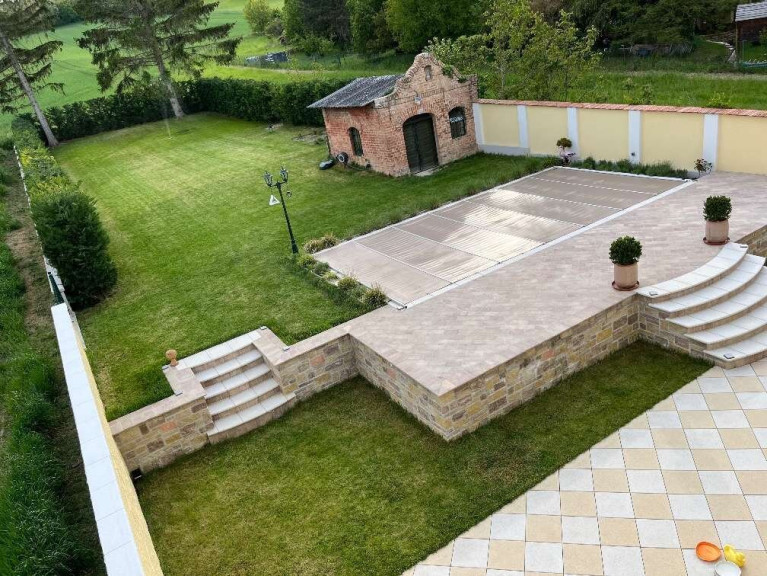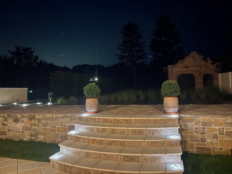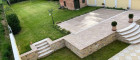 - Große untere Terrasse (ca. 60 m2), ebenfalls mit Leier-Steinen („Schönbrunn“ und „Belvedere“)