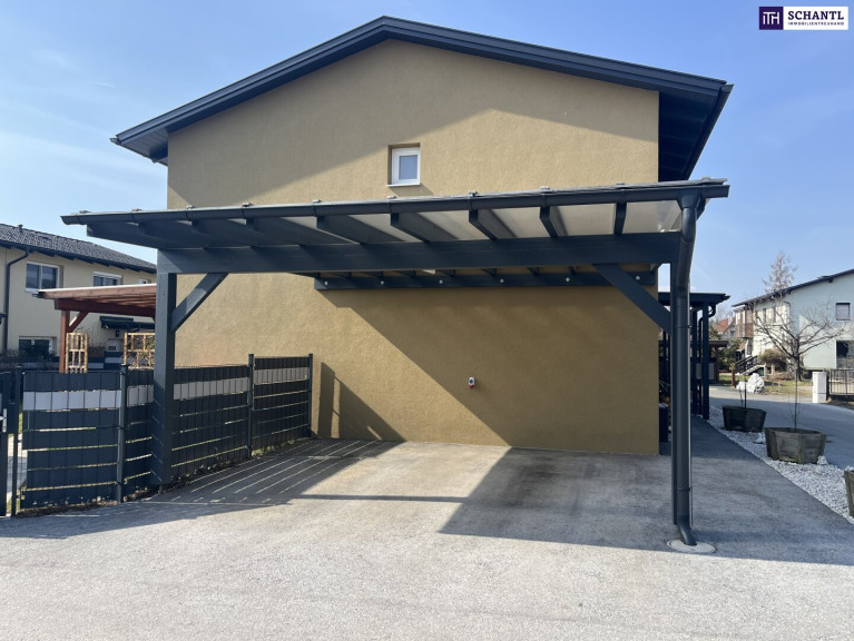 Ein großes Carport für 2 PKWs direkt am Haus komplettiert das Gesamtbild.