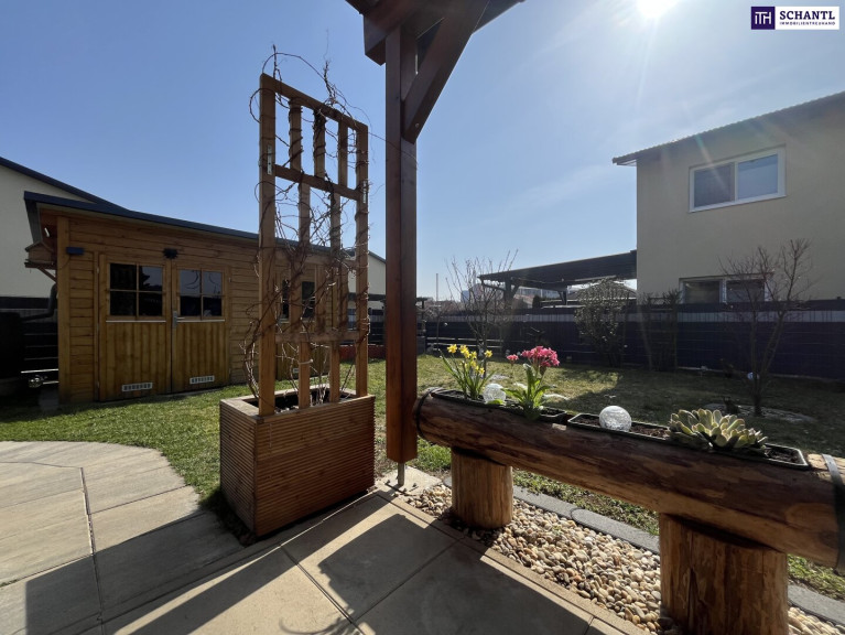 Vom Wohnbereich im EG (ca. 60m²), gelangt man direkt auf die komplett überdachte Terrasse, die mit integriertem Sonnenschutz einen geschützten Platz zum Entspannen bietet, ob bei Sonne, Regen oder einem gemütlichen Abend zu zweit. Insektenschutz und elektrische Rollläden im Wohnzimmer sorgen für Komfort und Privatsphäre. Der Garten ist pflegeleicht angelegt und ideal für alle, die Freiraum schätzen. Ein charmantes Holzgartenhaus erweitert die Nutzfläche und bietet Platz für Geräte, Fahrräder oder Hobbybedarf. Das gesamte Grundstück umfasst ca. 333 m² und schafft damit ein angenehmes Gleichgewicht zwischen Außenfläche und Pflegeaufwand.