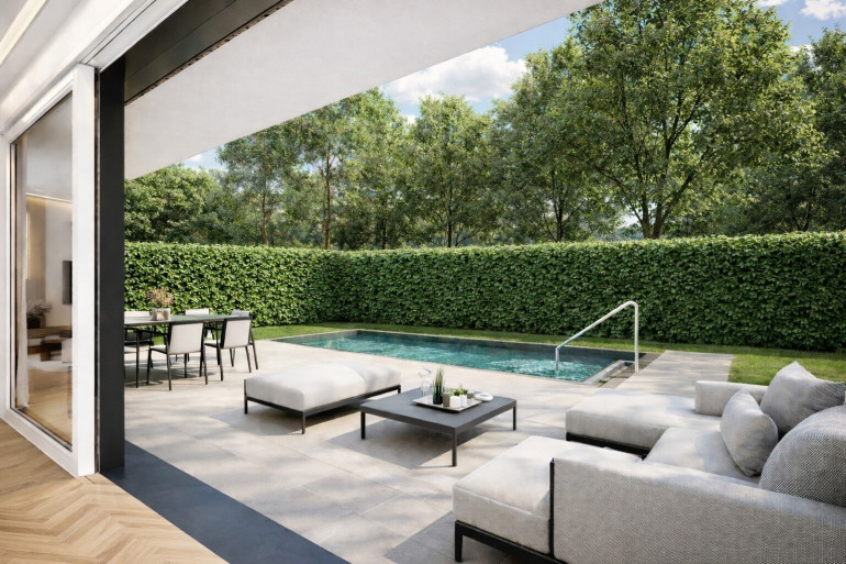 Auch hier sorgt der direkte Zugang auf die Terrasse für ein offenes, lichtdurchflutetes Wohngefühl. Der Grundriss ist offen und luftig gestaltet. Das Herzstück bildet der nahezu 56 m² große Wohn-Ess-Bereich mit integrierter Küche und einem separaten Speis- bzw. Abstellraum. Großzügige, bodentiefe Fenster fluten den Raum mit Tageslicht und schaffen einen fließenden Übergang auf die weitläufige Terrasse und den anschließenden Privatgarten – ein harmonischer Rückzugsort für Entspannung, Genuss und individuelle Gestaltungsmöglichkeiten. Auf Wunsch kann zudem ein Pool realisiert werden; dieser ist optional und nicht im Kaufpreis enthalten.