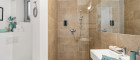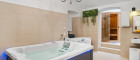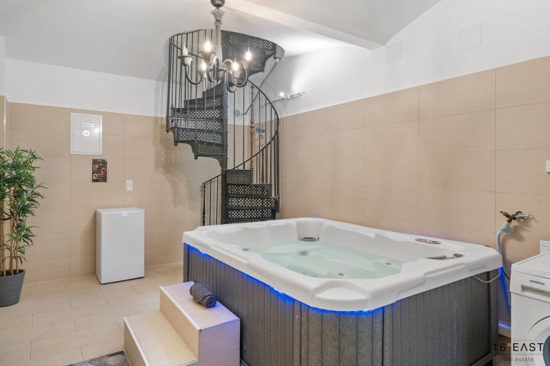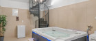 - Zimmer mit Whirlpool, Dusche und Verbindungstreppe zum Obergeschoss