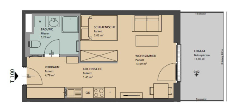 Die Wohnung verfügt über ca. 45 m² Nutzfläche und eine Loggia. Die Wohnräume sind mit Parkettboden, die Nassräume mit Fliesen ausgestattet. 3-fach-verglaste Fenster mit elektrischer Außenbeschattung sorgen für angenehmes Raumklima.