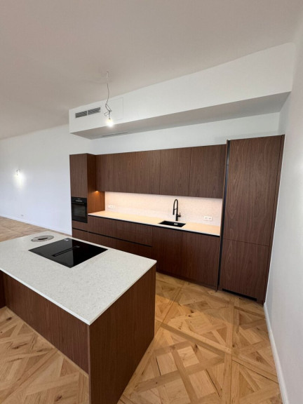 Der Mittelpunkt der Wohnung ist die weitläufige Wohnküche mit hochwertiger Tischlerküche, Kochinsel und Stein-Arbeitsfläche – ein Raum, der sowohl repräsentativ als auch alltagstauglich ist. Zwei Schlafzimmer verfügen jeweils über ein Bad en suite, ergänzt durch ein separates Gäste-WC. Ein großzügiger Abstell- bzw. Technikraum sorgt für Ordnung und Funktionalität.