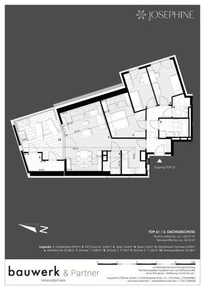 JOSEPHINE verkörpert den vollen Lebensgenuss und würdigt die Schönheit des Moments.In der Stoffellagasse 7 im 2. Bezirk, direkt am Wiener Prater, wird das Wohnprojekt JOSEPHINE vom renommierten Tiroler Bauträger bauwerk realisiert. Ein besonderes Merkmal dieses Projektes ist der unvergleichliche Blick auf den Prater und das Wiener Riesenrad. Insgesamt werden 60 hochwertige Wohnungen über 7 Etagen mit einzigartigem Grünblick errichtet. Das Angebot reicht von effizienten 2 Zimmerwohnungen bis zur luxuriösen Dachgeschosswohnung. Alle Wohneinheiten verfügen über private Freiflächen. Zudem stehen den Bewohnern ca. 30 Tiefgaragenstellplätze und Kellerabteile zur Verfügung. Das Projekt wurde zudem mit der klimaaktiv Bronze Zertifizierung ausgezeichnet.