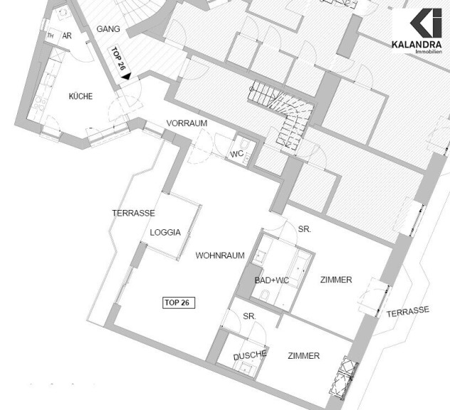 Vorraum, großer Wohnraum mit Zugang zu einer Terrasse + Loggia, Küche mit Zugang zu einem Abstellraum + Waschmaschinenanschluss, Schlafzimmer mit zugeordnetem Wannenbad + WC und Zugang zu der zweiten Terrasse, weiteres Schlafzimmer mit zugeordnetem Duschbad und begehbaren Schrankraum und ein separates WC.