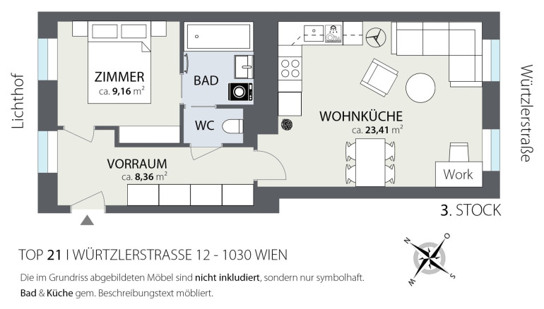 - AUSRICHTUNG: Wohnküche Süd-Ost-Ausrichtung zur Würtzlerstraße, Schlafzimmer nord-ostseitig zum Innenhof