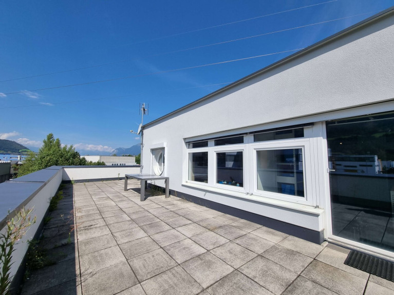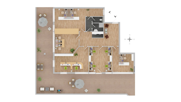 Auf rund 155 m² erwarten Sie fünf separat nutzbare Büroräume, eine Teeküche, ein WC sowie eine Dusche. Die südwestliche Ausrichtung sorgt für viel Tageslicht, während außenliegende Raffstores (neu 2024) ein angenehmes Arbeitsklima schaffen. Besonders attraktiv: die ca. 115 m² große Südwest-Terrasse – perfekt für Pausen oder informelle Meetings.