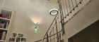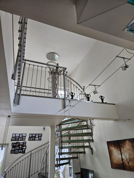 Der außergewöhnlich gestaltete Stiegenaufgang ins Obergeschoß mit offener Galerie bildet ein weiteres Highlight. Eine imposante, rund drei Meter lange italienische Designerleuchte setzt hier einen eindrucksvollen Akzent - die Treppe präsentiert sich in moderner Ausführung aus hochwertigem Edelstahl und stilvollen Glasstufen.