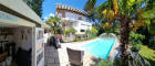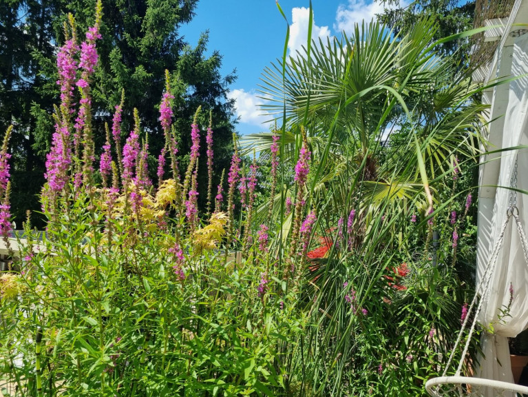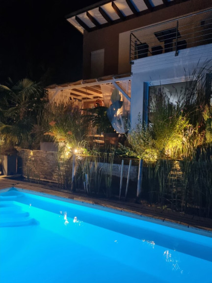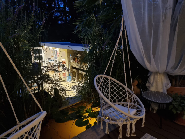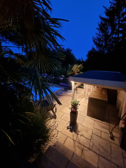 Eine weitere Terrasse auf dem Grundstück überzeugt mit einer charmanten, schattenspendenden Gartenlaube, die selbst an heißen Sommertagen einen angenehmen Rückzugsort bietet. Zusätzlich erwartet Sie ein exklusiver Wellnessbereich mit Sauna, Außendusche und Whirlpool.