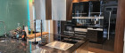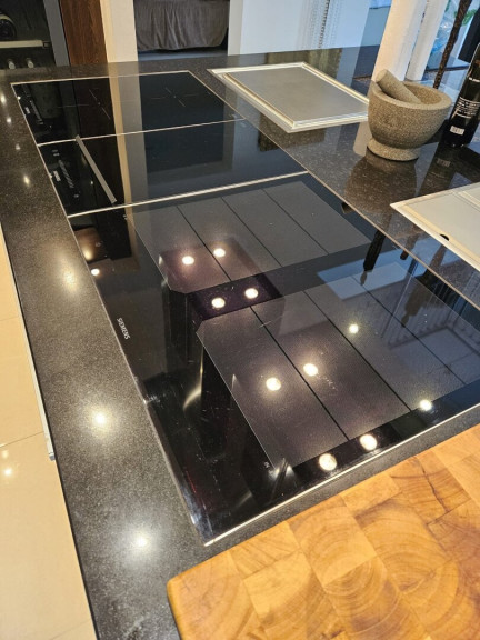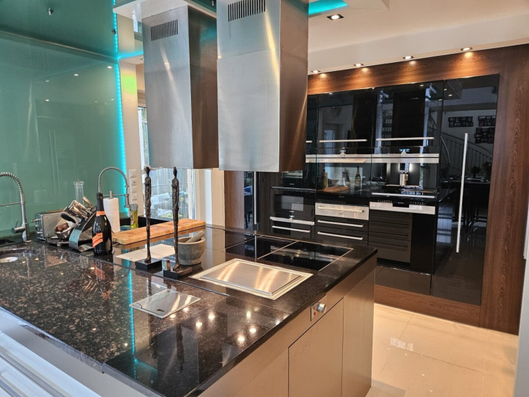 Die großzügige Kochinsel mit Induktions-, Ceran- und Teppanyaki-Kochflächen, zwei Abwaschbereichen, zwei leistungsstarken Dunstabzügen und edlen Naturstein-Arbeitsplatten schafft ein Kocherlebnis auf Spitzenniveau. Flächenbündig integrierte Geräte, perfekt platzierte Deckeneinbaustrahler und großzügig bemessener Stauraum verbinden hier Design mit Funktionalität.
