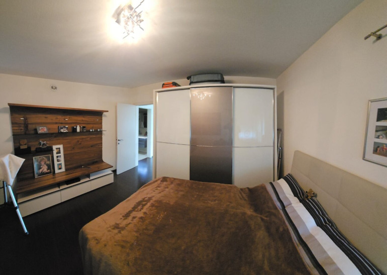 Das Hauptschlafzimmer ist Richtung Garten ausgerichtet und verfügt über einen direkten Zugang zur angrenzenden Terrasse. Ein großzügig bemessenes Ankleidezimmer mit viel Stauraum führt in das angrenzende, elegante Tageslicht-Badezimmer, das mit einer Badewanne mit Whirlpool ausgeführt und mit hochwertigen Badmöbeln ausgestattet ist. Eine Infrarotheizung sorgt zusätzlich für Komfort.