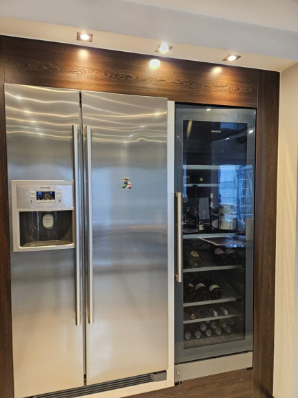 Hochwertige Siemens-Geräte – darunter ein Backofen mit Wärmeschublade, Dampfgarer, Mikrowelle, integrierte Kaffeemaschine, zwei Geschirrspüler sowie ein doppelseitiger Kühlschrank mit Eiswürfelbereiter und ein separater Weinkühler – garantieren höchsten Komfort.