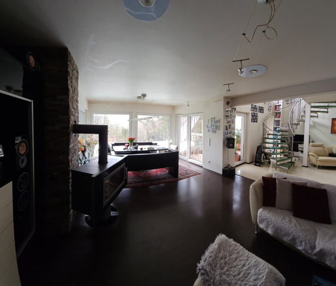 Der anschließende Wohnbereich beeindruckt durch seine großzügige, offene Architektur und herrlichem Grünblick. Bodentiefe Fenster unterstreichen den atriumähnlichen Charakter und schaffen eine einladende, lichtdurchflutete Atmosphäre. Ein drehbarer Kamin bildet das stilvolle Herzstück des Raumes und ist flexibel zum Lounge- oder Essbereich hin ausrichtbar, wodurch er in beiden Zonen für behagliche Wärme und besondere Wohnqualität sorgt.