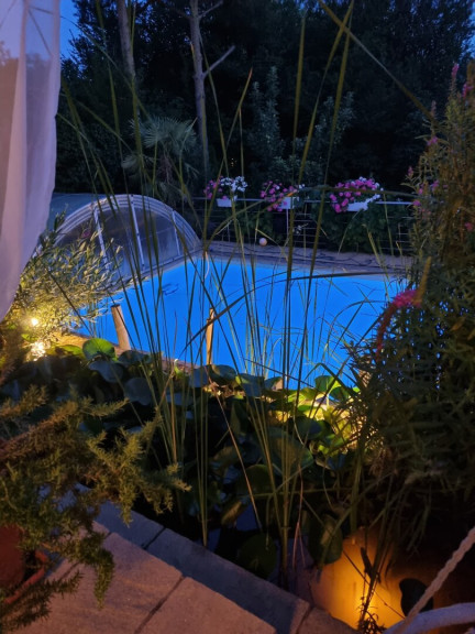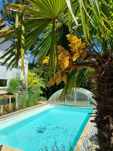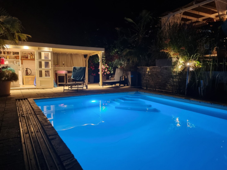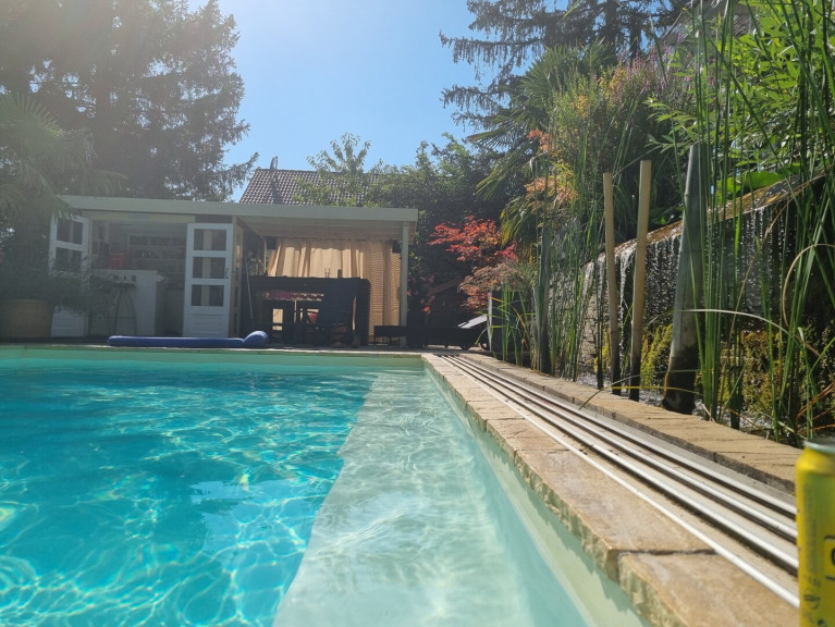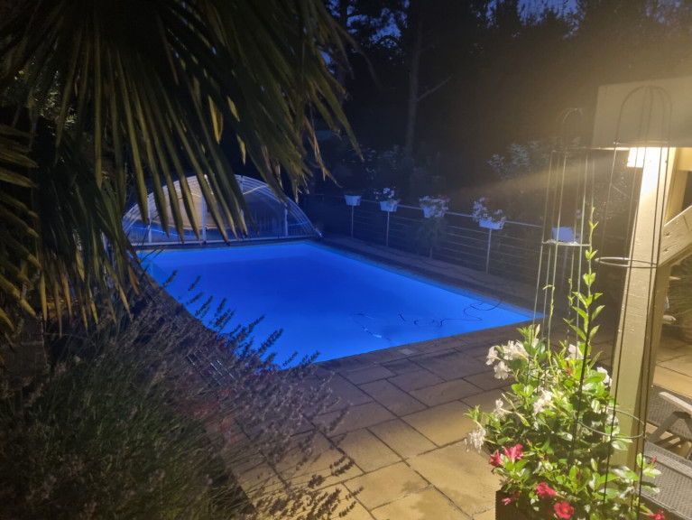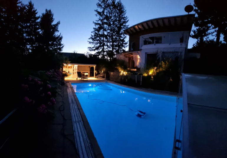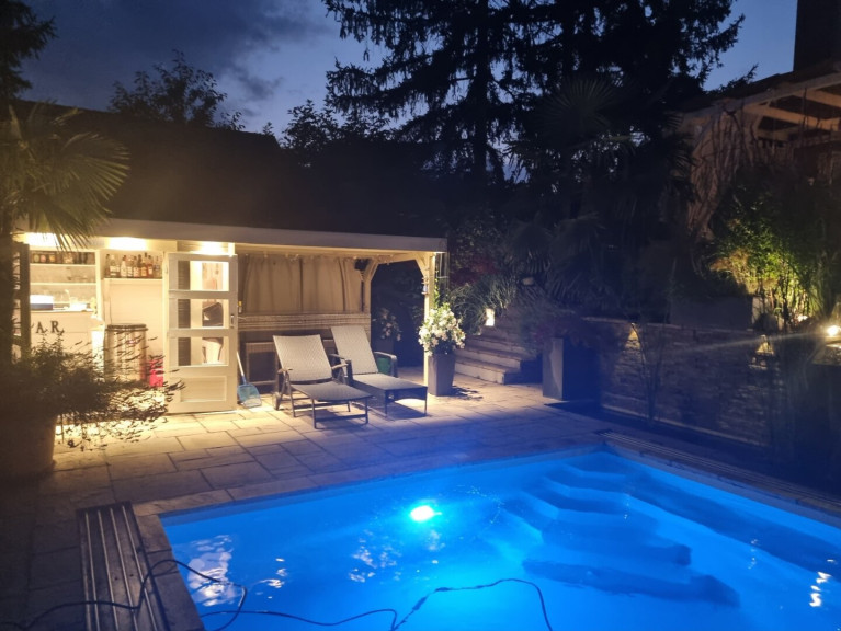 Ein besonderes Highlight stellt das gegenüber dem Pool situierte Gartenhaus dar, das eine vollständig eingerichtete Cocktailbar bereithält. Das ca. 7 x 4 m große, beheizbare Schwimmbecken mit eleganter Glasüberdachung lädt ganzjährig zum entspannten Badevergnügen ein.