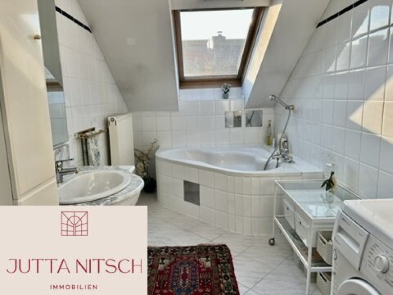 - Bedezimmer mit Waschtisch, Badewanne und Waschmaschinenanschluss