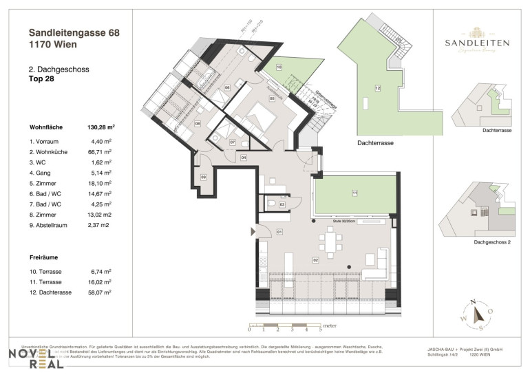 Zwei tolle Terrassen liegen hof- und ostseitig auf Wohnebene und sind direkt von der Wohnküche bzw. vom Master Bedroom erreichbar. Von der Wohnküche gelangt man weiters über eine Treppe auf die darüberliegende traumhafte 58 m² große Dachterrasse mit Blick über Wien.