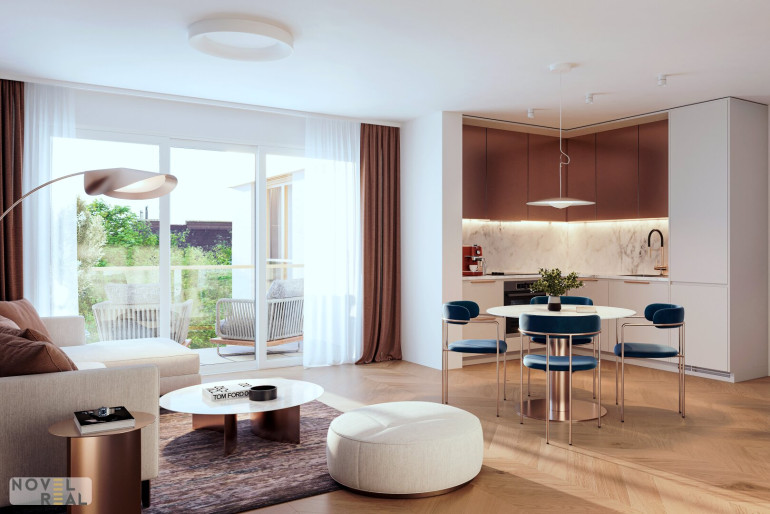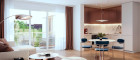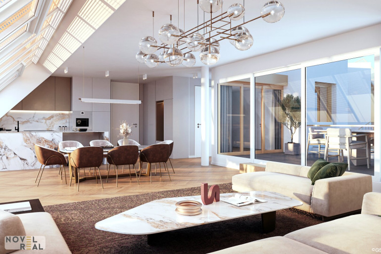 Der weitläufige Wohn-, Koch- und Essbereich bildet das kommunikative Zentrum der Einheit und öffnet sich, ebenso wie eines der Schlafzimmer, direkt zur südseitigen Terrasse, die den Wohnraum ins Freie erweitert und für eine hohe Wohnqualität sorgt.