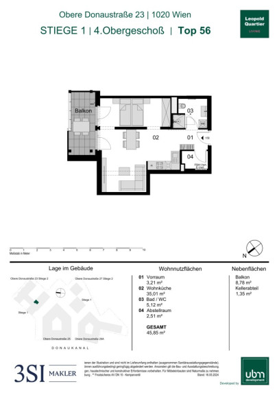 Diese moderne Wohnung befindet sich im 4. Obergeschoß. Die Einheit verfügt über eine Wohnnutzfläche von insgesamt 45,85 m² und bietet zusätzlich einen 8,78 m² großen Balkon.