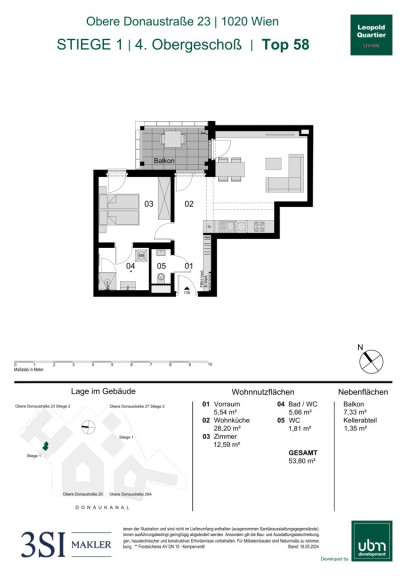 Diese moderne Wohnung befindet sich im 4. Obergeschoß. Die Einheit verfügt über eine Wohnnutzfläche von insgesamt 53,80 m² und bietet zusätzlich einen 7,33 m² großen Balkon.