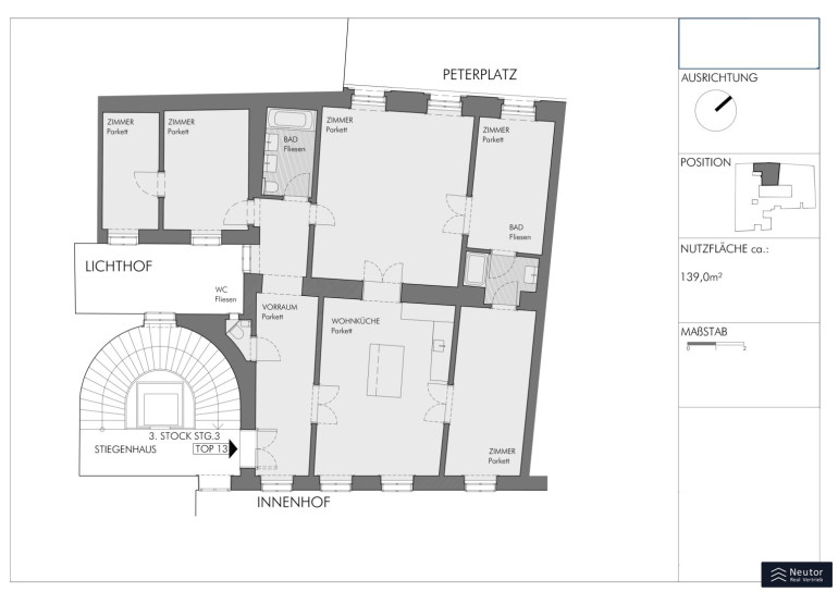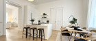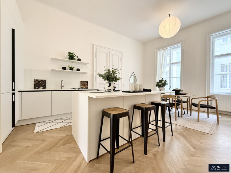 Der großzügige Vorraum eröffnet ein einladendes Entree und führt zu den klar strukturierten Räumen dieser außergewöhnlichen Wohnung. Die moderne Wohnküche mit hochwertigen Einbaugeräten lädt zum Kochen, Genießen und geselligen Zusammensein ein und wird so zum stilvollen Herzstück der Wohnung. Das angrenzende Wohn- und Esszimmer beeindruckt mit seiner Großzügigkeit, den hohen Decken und edlen Doppelflügeltüren und schafft eine offene, einladende Atmosphäre. Von hier bietet sich ein direkter Blick auf die Peterskirche, der den besonderen Charme und das exklusive Flair dieser Lage auf eindrucksvolle Weise unterstreicht.