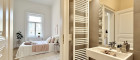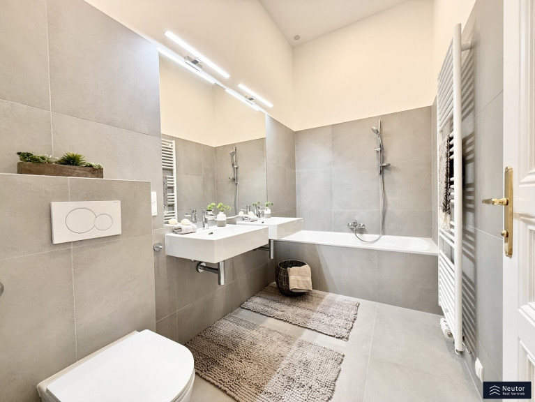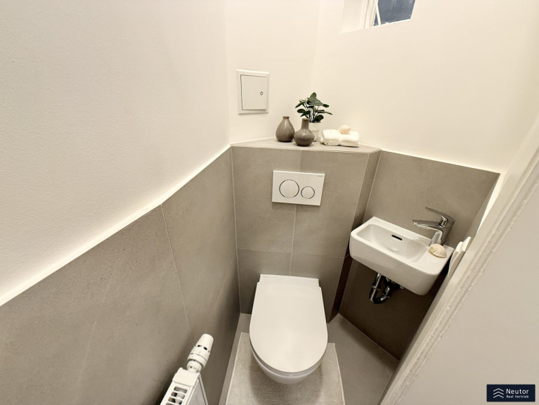 Vom Wohnbereich aus gelangt man in eines der fünf Zimmer, das über ein angrenzendes Badezimmer mit Dusche verfügt. Dieses Durchgangsbadezimmer erschließt zudem ein weiteres Zimmer und verbindet Funktionalität mit einer eleganten Raumgestaltung. Auf der gegenüberliegenden Seite des Gangs befindet sich ein weiteres großzügiges Zimmer, ergänzt durch einen weiten Abstellraum mit Fenster, der sich ideal als begehbare Garderobe oder exklusives Ankleidezimmer nutzen lässt. Ein zusätzliches luxuriöses Badezimmer mit Badewanne, Doppelhandwaschbecken und WC beeindruckt durch seine hochwertige Ausstattung und das elegante Spa-Ambiente.