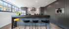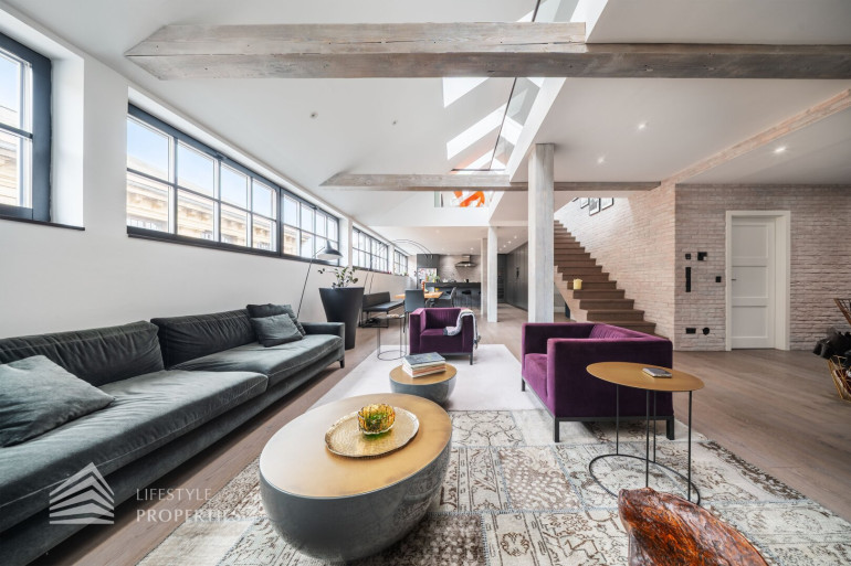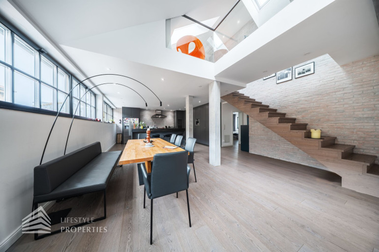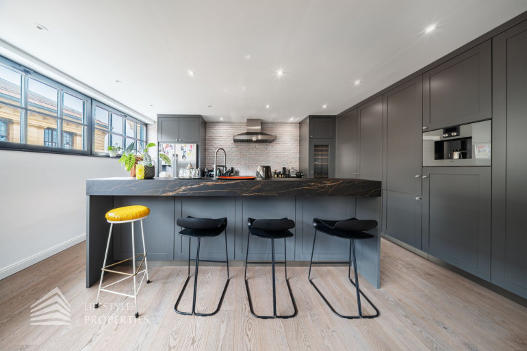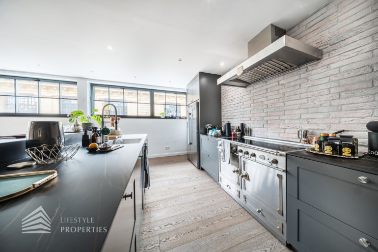 Geradeaus eröffnet sich der beeindruckende, rund 89 m² große, loftartige Wohnbereich. Dieser bietet viel Raum für eine großzügige Wohnlandschaft, sowie einen einladenden Essbereich. Die offen integrierte Designerküche überzeugt durch ihre hochwertige Ausstattung und durchdachte Funktionalität. Sie verfügt unter anderem über einen französischen Designer-Herd, einen Weinkühlschrank, eine eingebaute Kaffeemaschine von Gaggenau, einen amerikanischen Kühlschrank, sowie einen Geschirrspüler. Die elegante Stein-Arbeitsplatte geht nahtlos in eine stilvolle Bar mit drei Sitzplätzen über, ergänzt durch edle Barhocker.