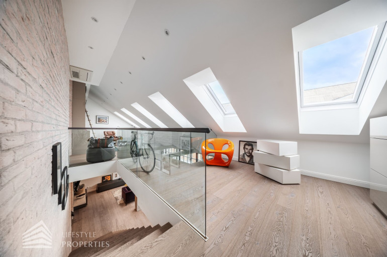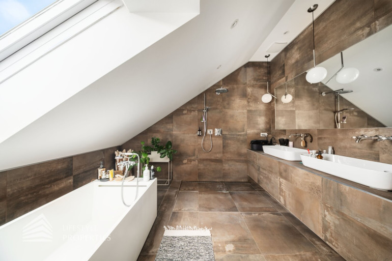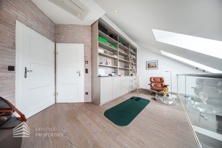 Über eine hochwertige Holztreppe gelangen Sie in das obere Geschoß. Eine großzügige Galerie erschließt zwei weitere Zimmer, sowie ein luxuriös ausgestattetes Badezimmer mit Badewanne, Dusche, Doppelwaschbecken und eine separate Toilette.