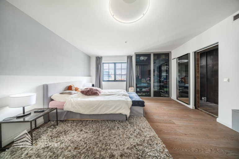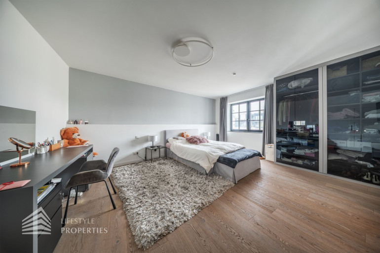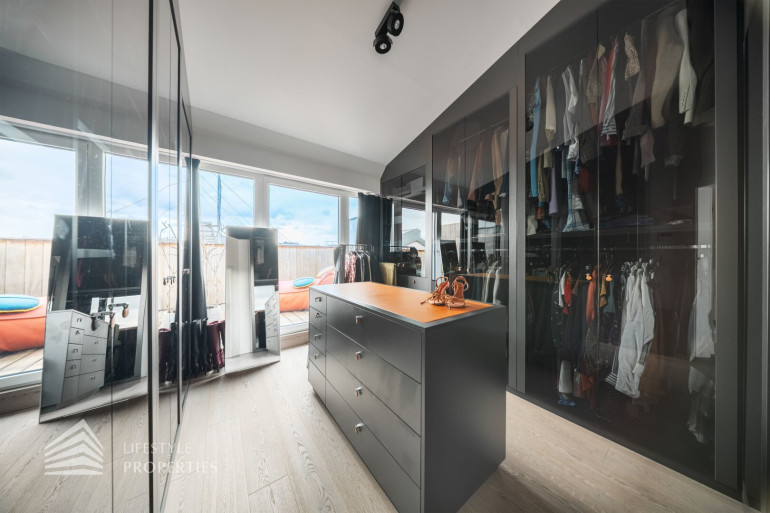 Angrenzend an das Badezimmer befindet sich ein rund 27 m² großes Schlafzimmer mit schönem Ausblick und direktem Zugang zur einladenden Terrasse. Ein weiteres Zimmer wird derzeit als elegantes Ankleidezimmer genutzt. Es ist mit hochwertigen Materialien ausgestattet und bietet ebenfalls einen Ausgang auf die Terrasse. Bei Bedarf lässt sich dieser Raum einfach in ein weiteres Schlafzimmer umwandeln.
