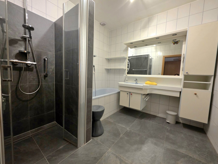 Das Badezimmer ist sowohl mit einer Badewanne als auch mit einer Dusche ausgestattet, das WC befindet sich separat.