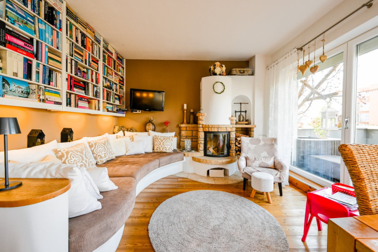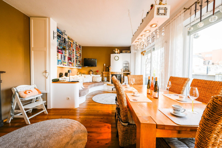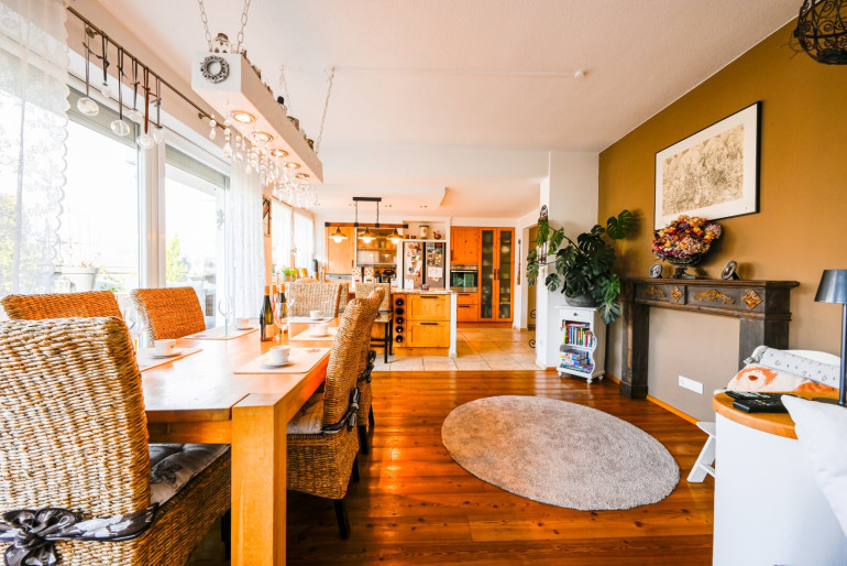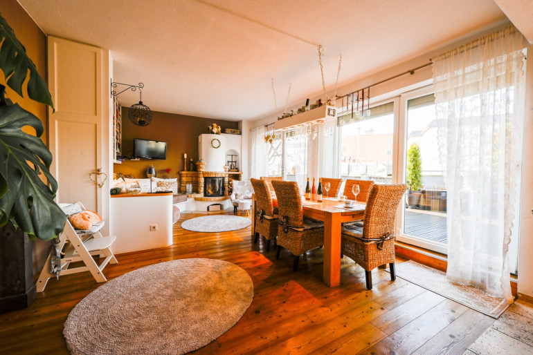 Der großzügige Wohn- und Essbereich bildet das Herzstück der Wohnung. Große Fensterflächen durchfluten die Räume mit Tageslicht und schaffen eine freundliche, offene Atmosphäre. Der direkte Zugang zur weitläufigen Terrasse verbindet Innen- und Außenbereich auf harmonische Weise – ideal für entspannte Stunden oder gesellige Abende. Der holzbeheizte Kamin sorgt für eine heimelige Atmosphäre in ihrem neuen Eigenheim.