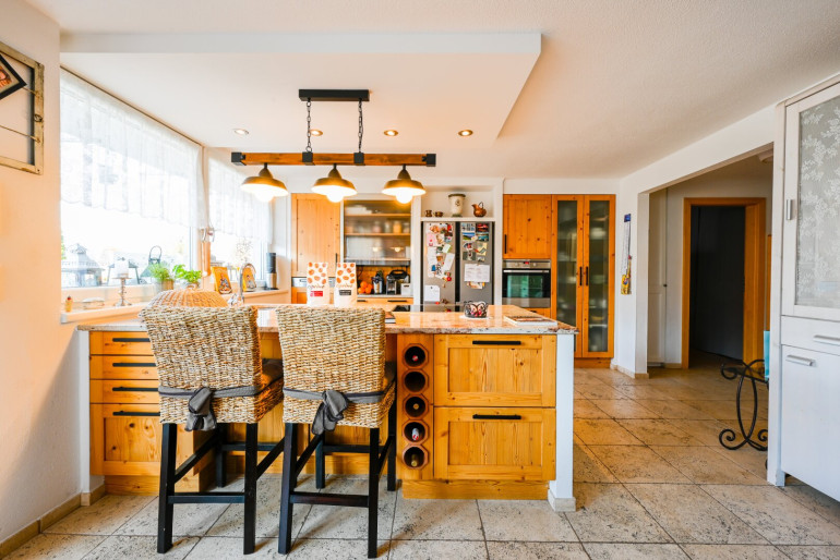 Die offene Küche ist funktional und zeitlos gestaltet und fügt sich nahtlos in den Wohnbereich ein. Sie bietet ausreichend Arbeitsfläche sowie Stauraum und macht gemeinsames Kochen zu einem besonderen Erlebnis.