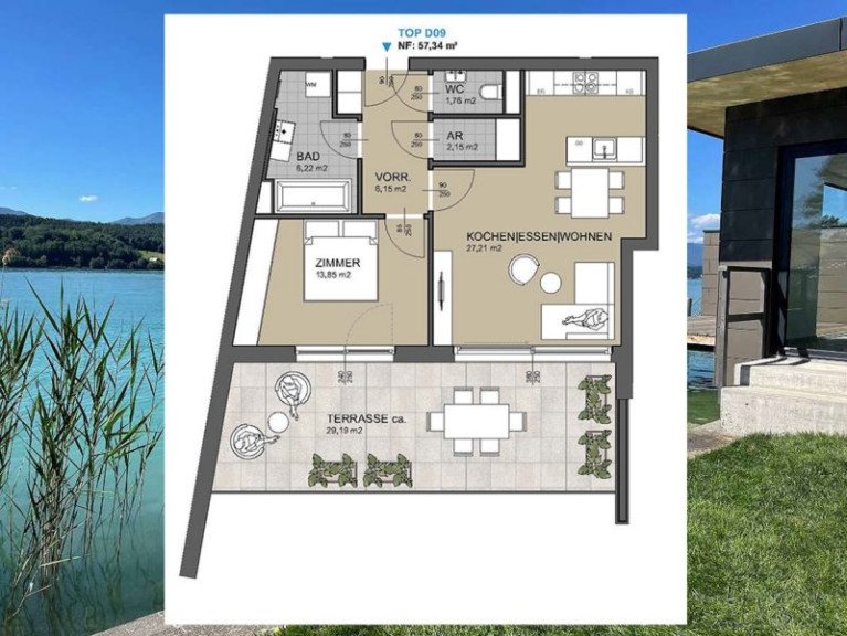 Die reine Wohnfläche beträgt 57,34 m2 und die Terrassenfläche beträgt 29,19 m2, welche überdacht ist und als Loggia zu bezeichnen ist.
