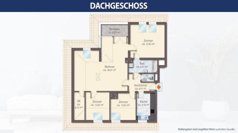 Wohn-/Essbereich: ca. 48,07 m², Zimmer 1: ca. 23,85 m², Zimmer 2: ca. 12,82 m², Zimmer 3: ca. 12,65 m², Küche: ca. 9,50 m², Bad: ca. 6,47 m², WC: ca. 2,18 m², Abstellraum: ca. 6,32 m², Vorzimmer: ca. 6,91 m², Terrasse: ca. 6,03 m²