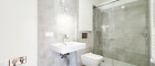 - Badezimmer mit Dusche, Waschbecken, Toilette und Waschmaschinenanschluss
