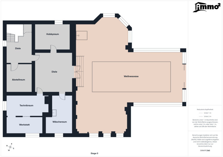 Vorraum, Wellnessoase mit beheiztem Indoor-Pool, Ruhebereich und Dusche, direkter Zugang in den Garten/zur Sauna, Waschraum, Vorratsräume, Technik-/Heizraum & Hobbyraum.